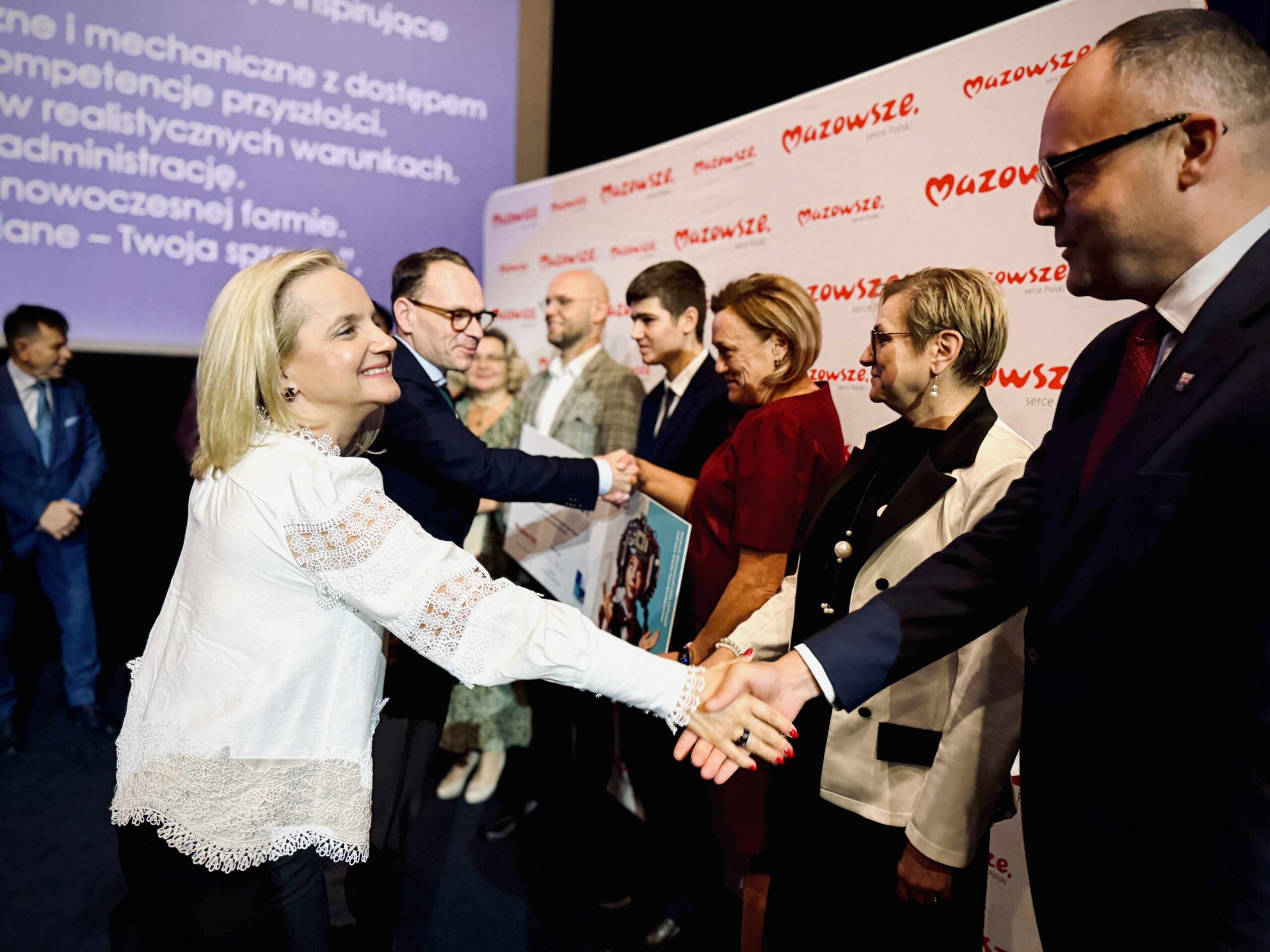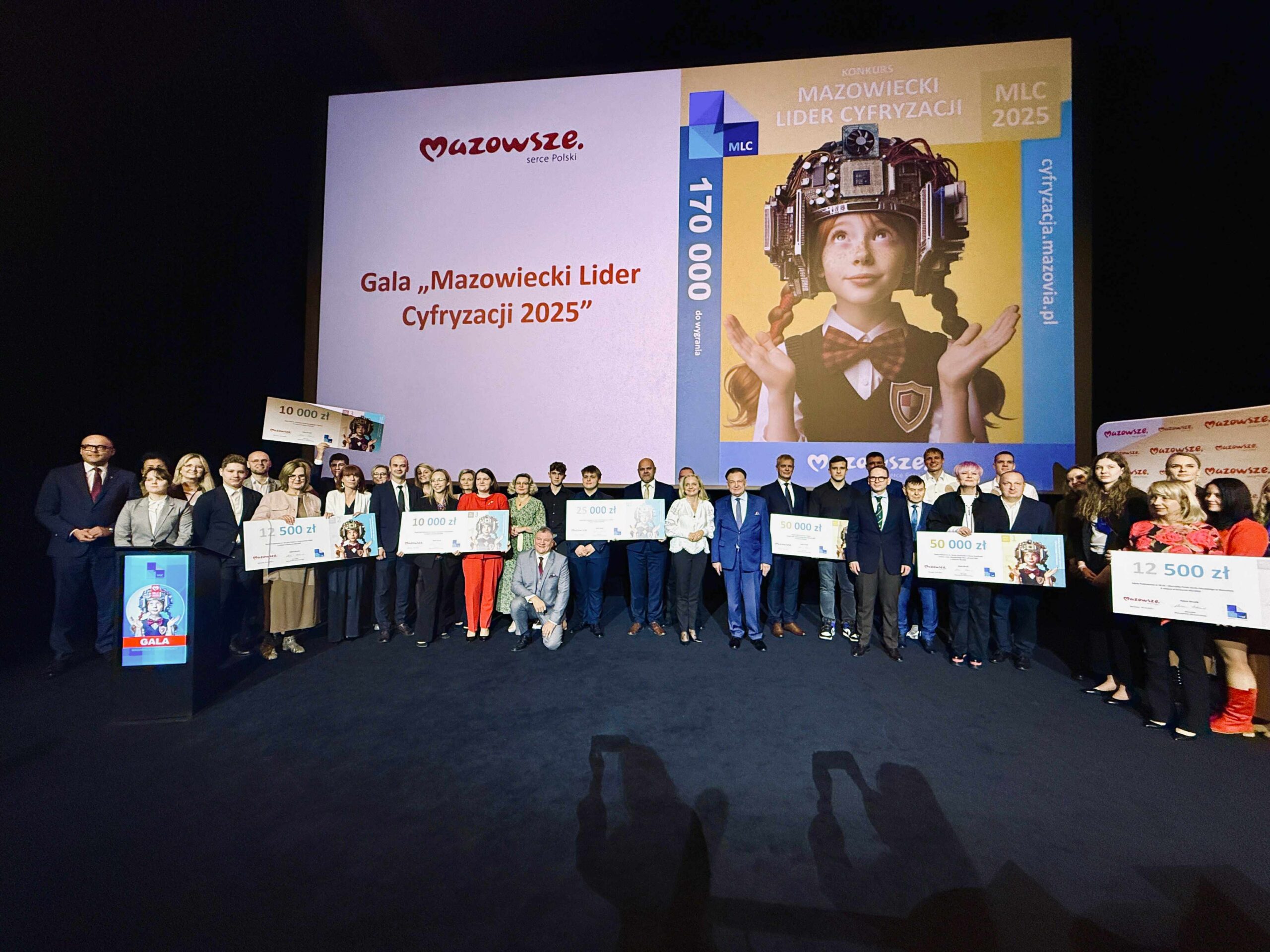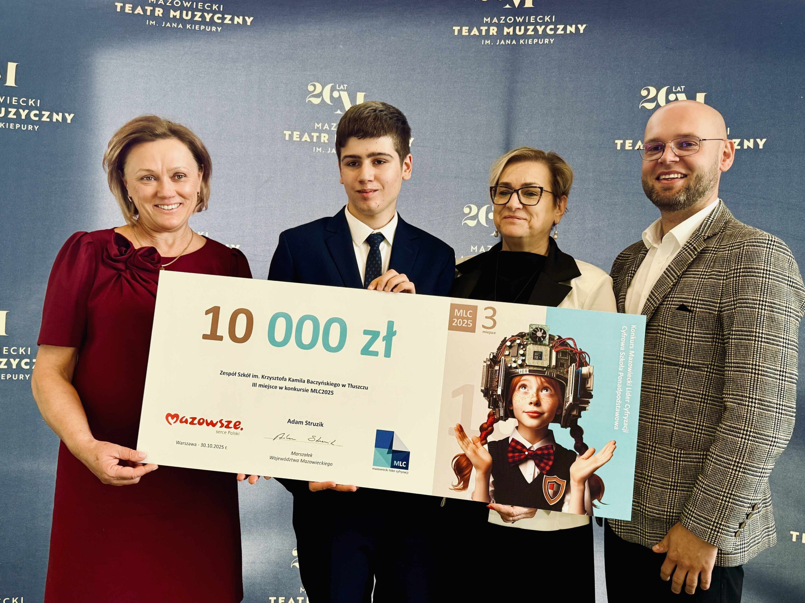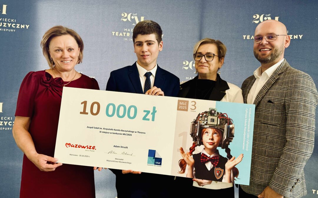 30 października 2025r. reprezentacja Zespołu Szkół im. K.K.Baczyńskiego w Tłuszczu w składzie: Dyrektor Anna Białek – Kowalska, Wicedyrektor Marek Leszcz, Kierownik Szkolenia Praktycznego Renata Miszczuk, Ewa Żmudzka, Kierownik Gospodarczy Marta Przybysz i reprezentant uczniów Jeremiasz Tucholski uczestniczyła w gali finałowej konkursu „Mazowiecki Lider Cyfryzacji 2025”, podczas której Marszałek Mazowsza Adam Struzik oraz Mazowiecka Kurator Oświaty Wioletta Krzyżanowska uhonorowali instytucje i szkoły wdrażające nowatorskie i bezpieczne rozwiązania cyfrowe w edukacji. Wraz z naszą reprezentacją szkolną na uroczystości pojawili się przedstawiciele organu prowadzącego szkołę, czyli Powiatu Wołomińskiego – Starosta Arkadiusz Werelich oraz Wicestarosta Katarzyna Pazio oraz Gminy Tłuszcz – Burmistrz Beata Skulimowska.