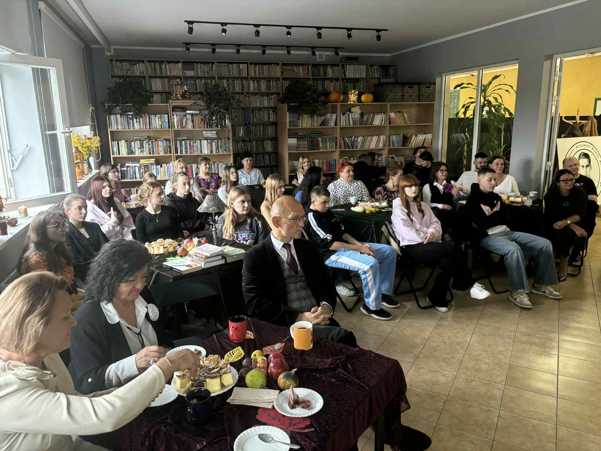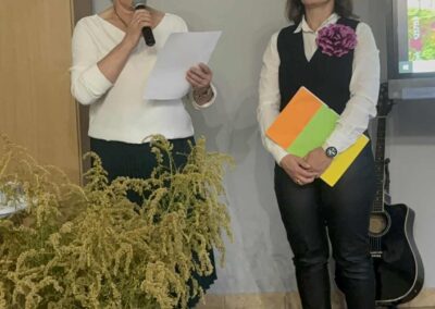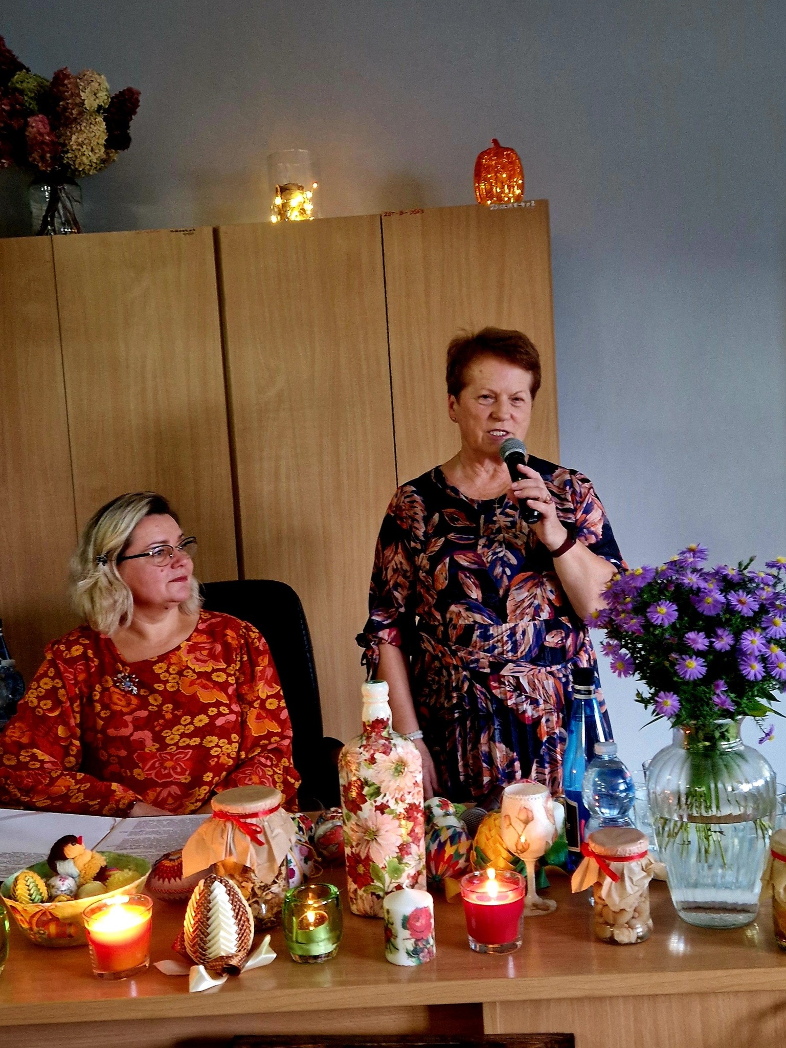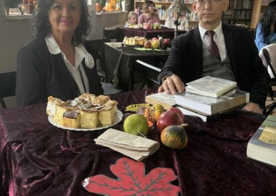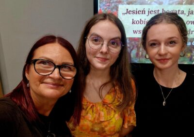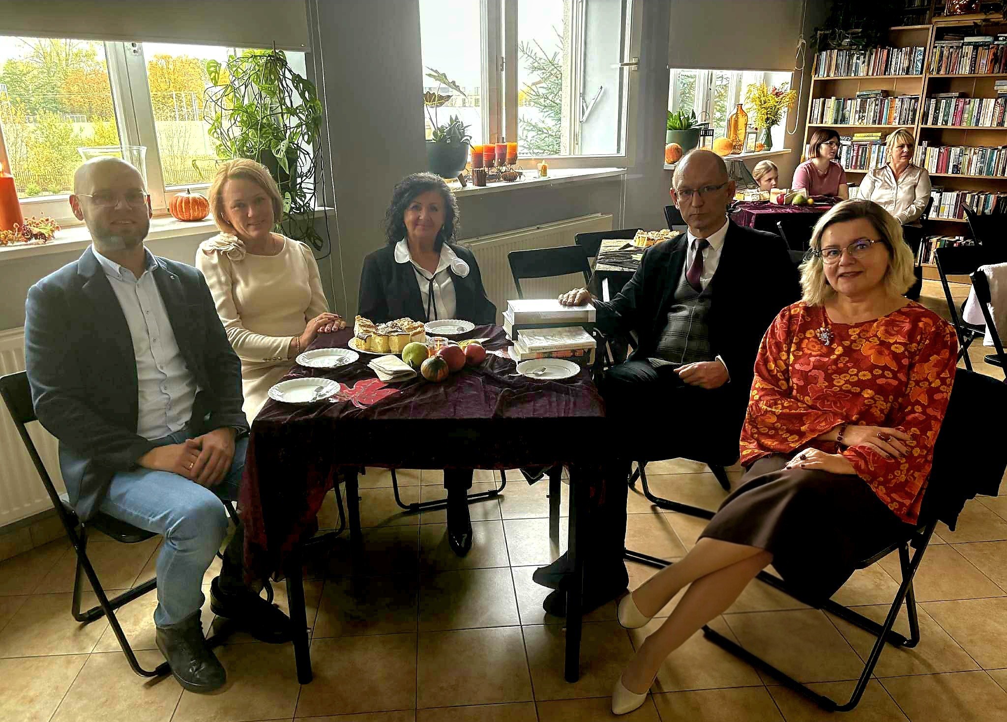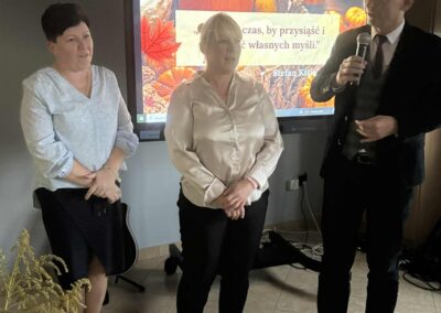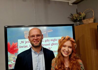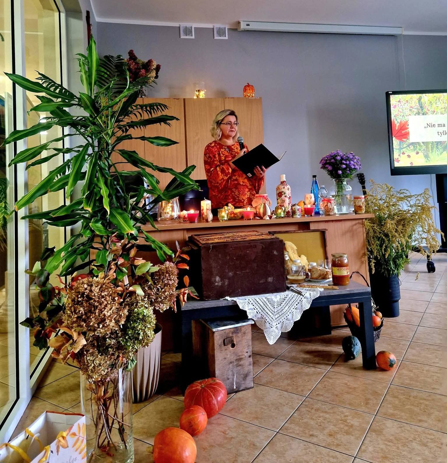 Ale jesień ma także inną twarz – ciemną, nieprzyjemną, z zacinającym, zimnym deszczem i wiejącym wiatrem. Wtedy najchętniej, aby poprawić sobie nastrój, włączamy lampeczki, zapalamy świeczuszki zapachowe i wyciągamy kocyki. Ale są również osoby uzdolnione artystycznie i długie wieczory lubią spędzać na przygotowaniu dekoracji jesiennych. I o tym opowiedziała Aleksandra Sobolewska – przedstawicielka Uniwersytetu III Wieku w Tłuszczu. A jeśli ktoś takich uzdolnień nie posiada, może np. czytać książki. Ale co wybrać? O tym opowiedział Dyrektor Biblioteki Publicznej w Tłuszczu Robert Szydlik. Zaprezentował 5 pozycji książkowych pochodzących z różnych kręgów kulturowych. A może poezja? To doskonałe rozwiązanie na długi, jesienny wieczór, zwłaszcza gdy możemy zrobić sobie kawkę czy herbatkę jesienną. U nas serwowały je Daria Rudnik z klasy 2LO, Marta Węcławek i Julianna Tarka z klasy 1LO a strofy poezji przytoczyły przedstawicielki z Grupy Rekonstrukcji Historycznej Ludności Cywilnej „Rajski Ptak” z Tłuszcza. Ewa Laskowska przeczytała wiersz Juliana Tuwima „Kapuśniaczek” a Bożena Baranowska utwór Adama Asnyka „Astry”.