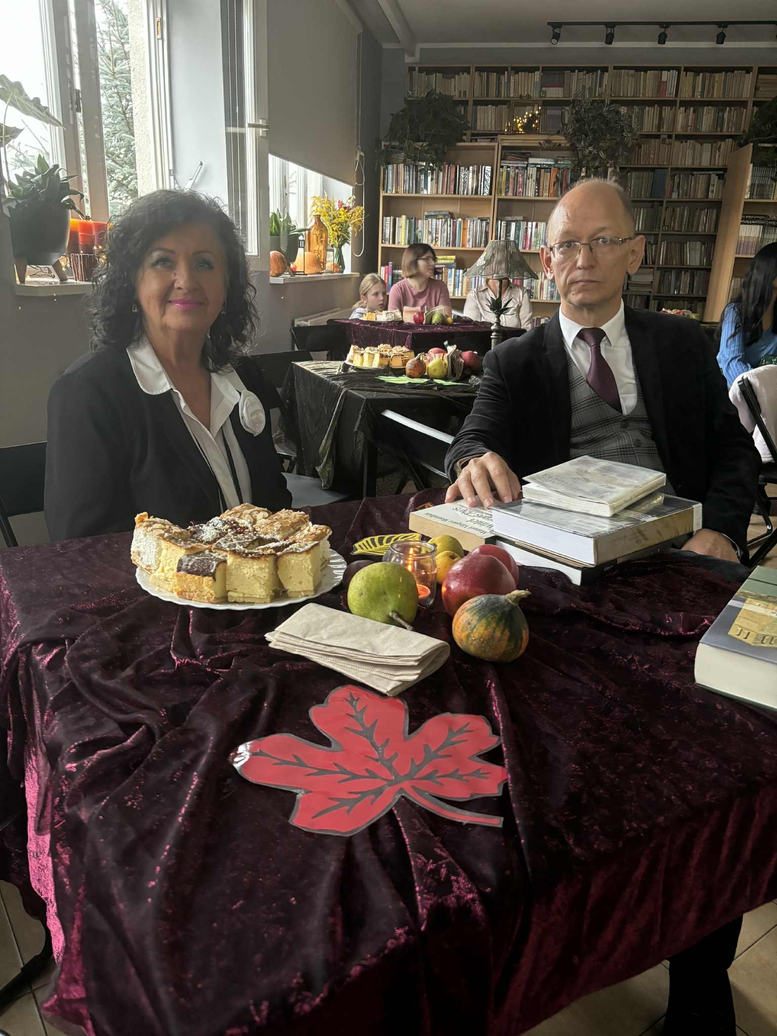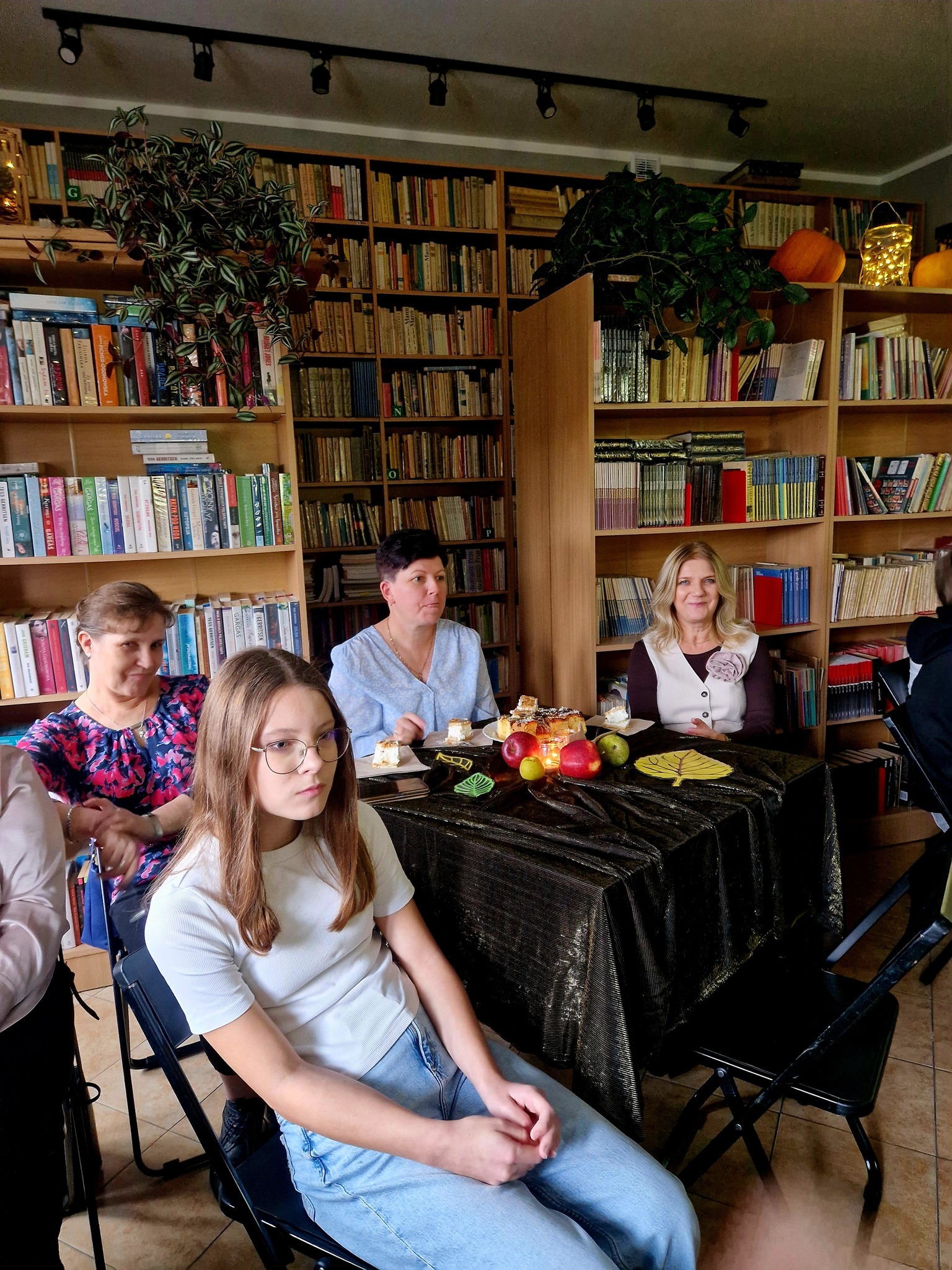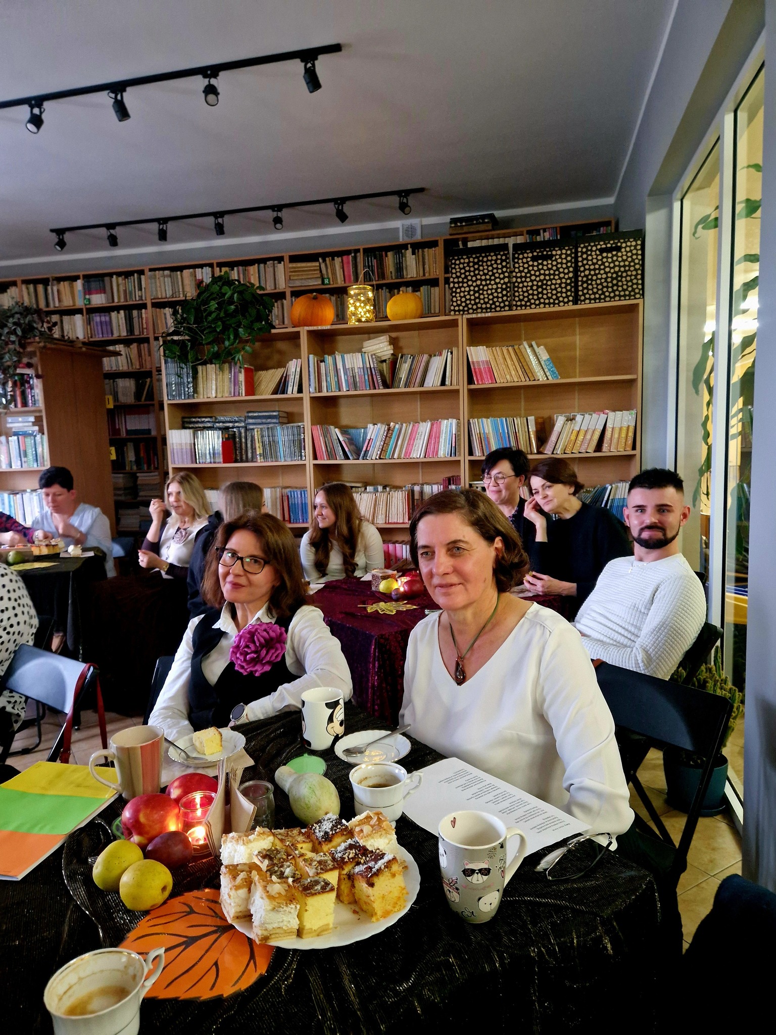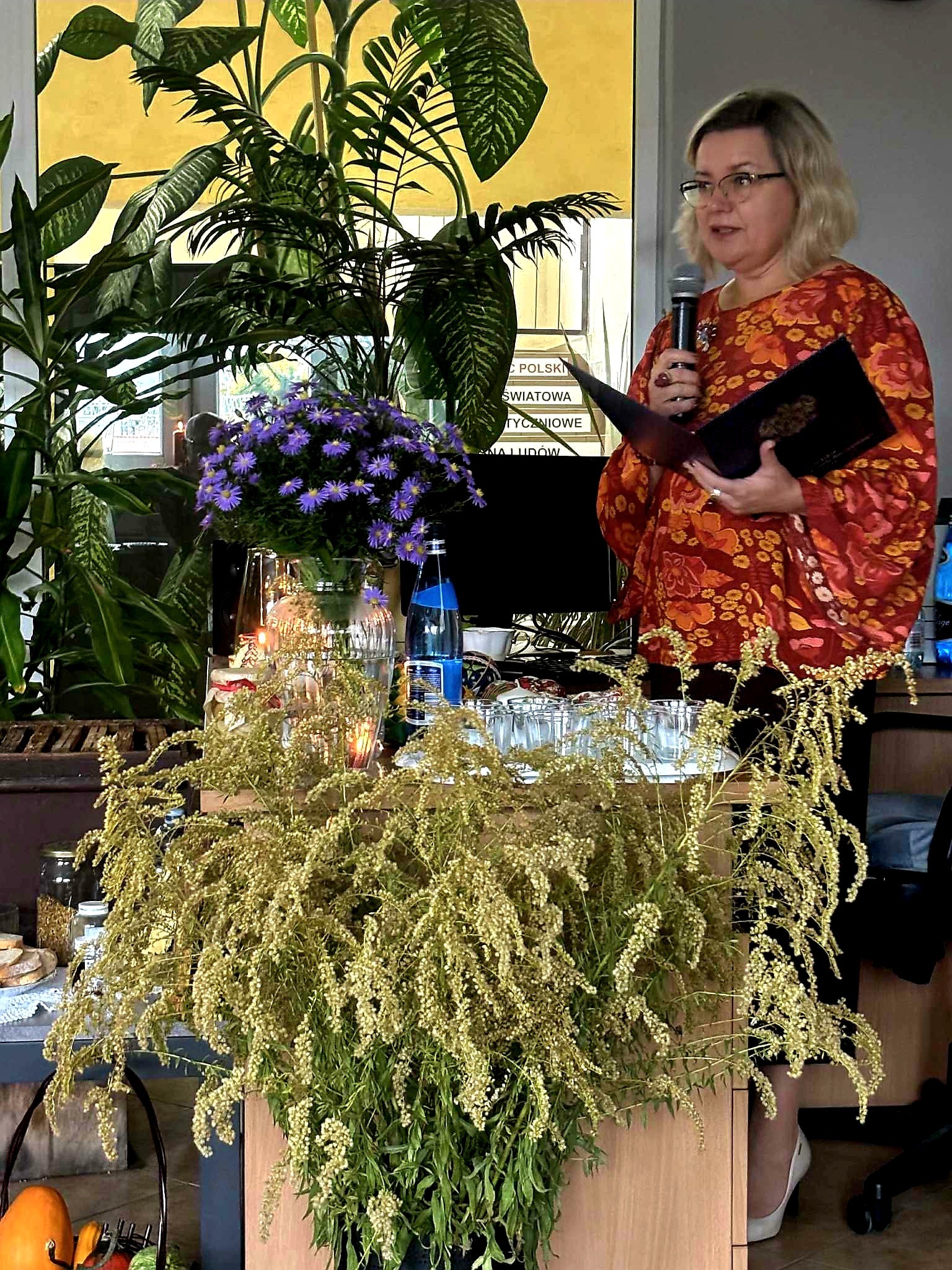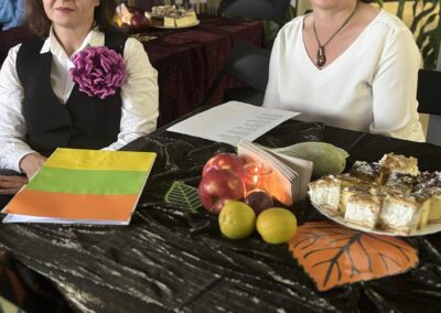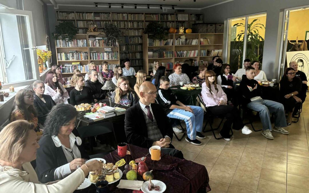 Ale jesień ma także inną twarz – ciemną, nieprzyjemną, z zacinającym, zimnym deszczem i wiejącym wiatrem. Wtedy najchętniej, aby poprawić sobie nastrój, włączamy lampeczki, zapalamy świeczuszki zapachowe i wyciągamy kocyki. Ale są również osoby uzdolnione artystycznie i długie wieczory lubią spędzać na przygotowaniu dekoracji jesiennych. I o tym opowiedziała Aleksandra Sobolewska – przedstawicielka Uniwersytetu III Wieku w Tłuszczu. A jeśli ktoś takich uzdolnień nie posiada, może np. czytać książki. Ale co wybrać? O tym opowiedział Dyrektor Biblioteki Publicznej w Tłuszczu Robert Szydlik. Zaprezentował 5 pozycji książkowych pochodzących z różnych kręgów kulturowych. A może poezja? To doskonałe rozwiązanie na długi, jesienny wieczór, zwłaszcza gdy możemy zrobić sobie kawkę czy herbatkę jesienną. U nas serwowały je Daria Rudnik z klasy 2LO, Marta Węcławek i Julianna Tarka z klasy 1LO a strofy poezji przytoczyły przedstawicielki z Grupy Rekonstrukcji Historycznej Ludności Cywilnej „Rajski Ptak” z Tłuszcza. Ewa Laskowska przeczytała wiersz Juliana Tuwima „Kapuśniaczek” a Bożena Baranowska utwór Adama Asnyka „Astry”.
