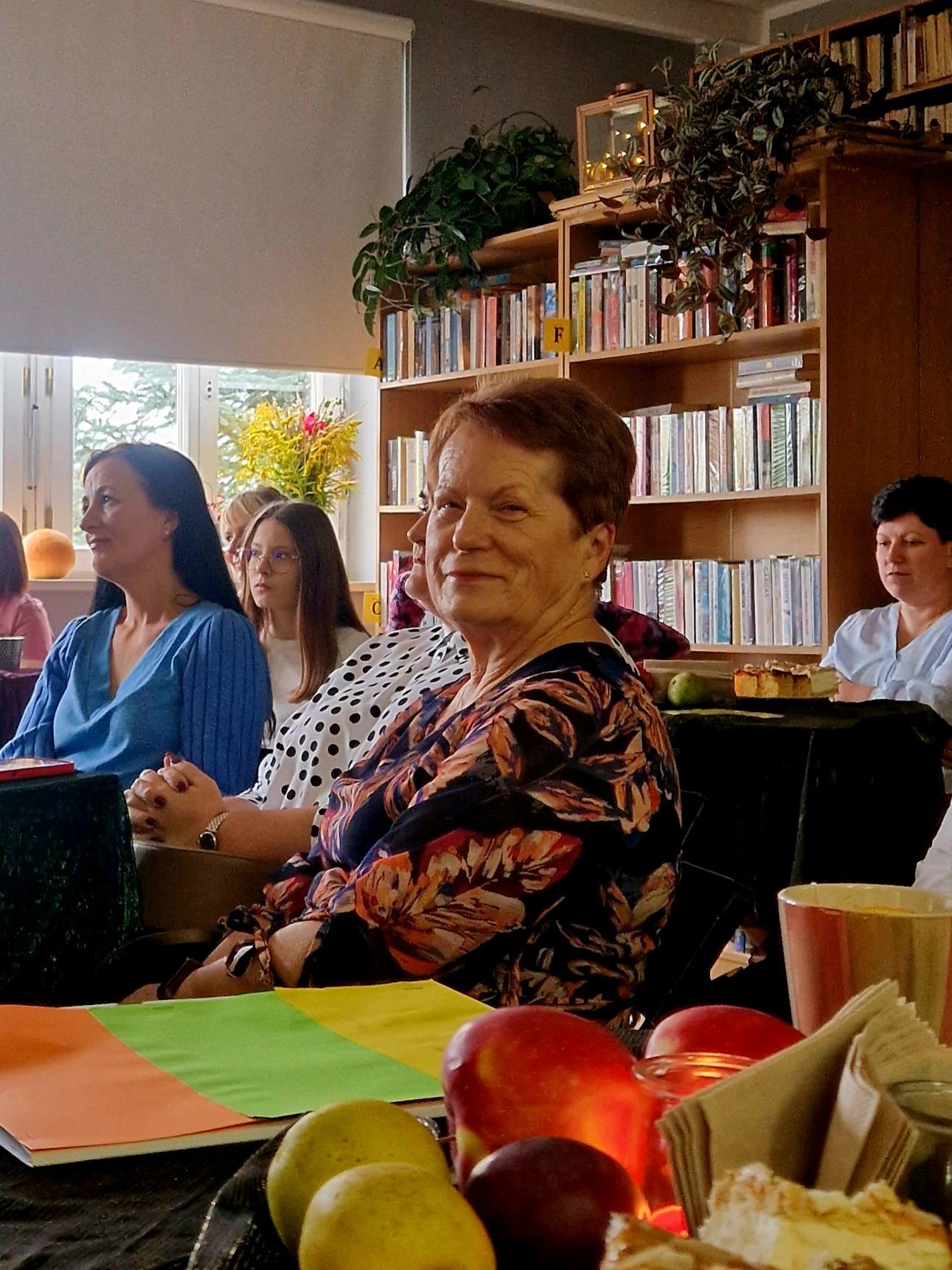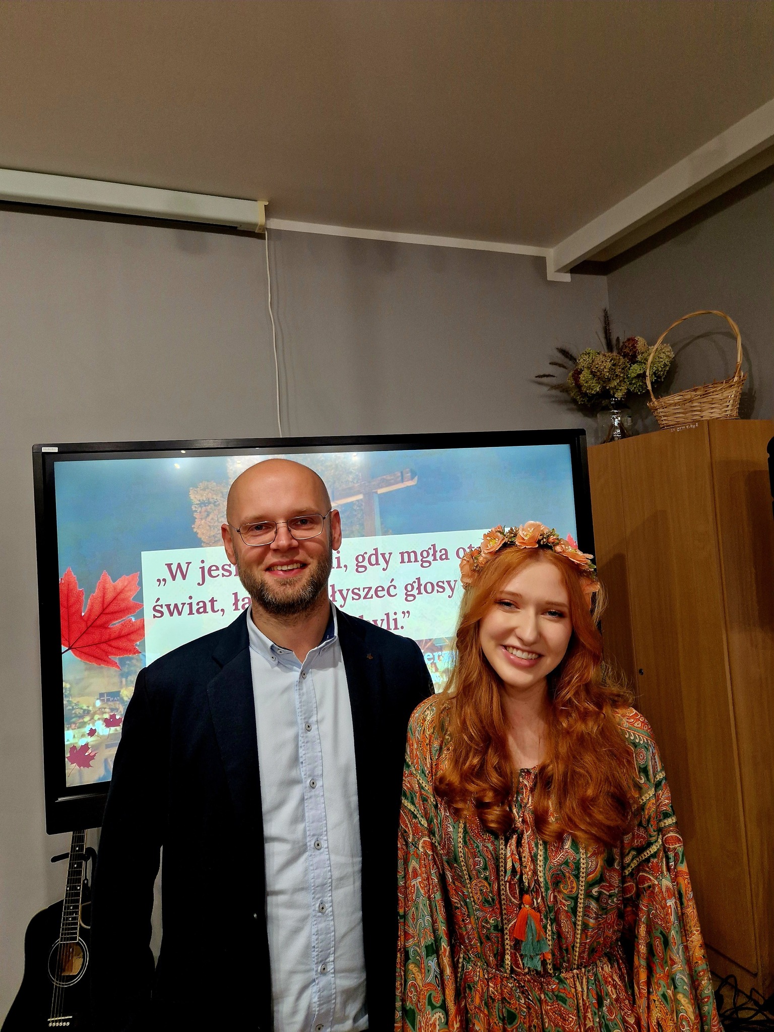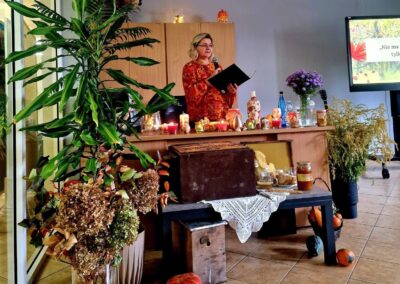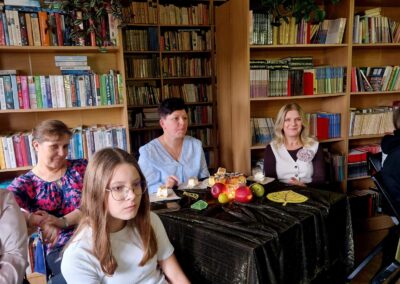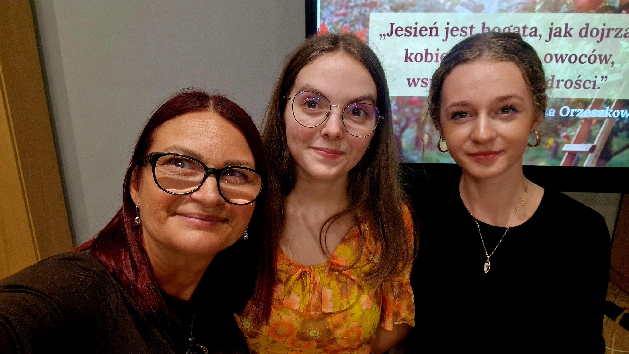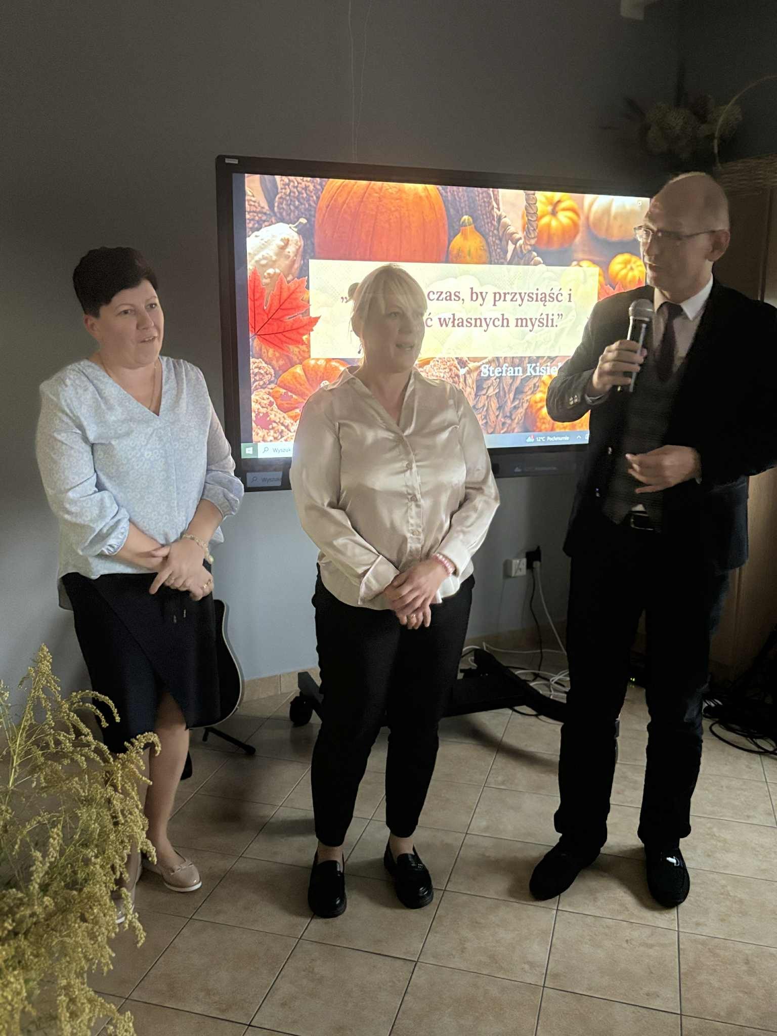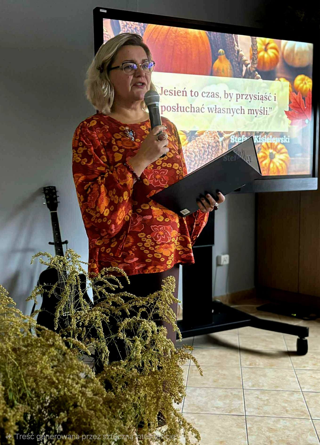 Ale jesień ma także inną twarz – ciemną, nieprzyjemną, z zacinającym, zimnym deszczem i wiejącym wiatrem. Wtedy najchętniej, aby poprawić sobie nastrój, włączamy lampeczki, zapalamy świeczuszki zapachowe i wyciągamy kocyki. Ale są również osoby uzdolnione artystycznie i długie wieczory lubią spędzać na przygotowaniu dekoracji jesiennych. I o tym opowiedziała Aleksandra Sobolewska – przedstawicielka Uniwersytetu III Wieku w Tłuszczu. A jeśli ktoś takich uzdolnień nie posiada, może np. czytać książki. Ale co wybrać? O tym opowiedział Dyrektor Biblioteki Publicznej w Tłuszczu Robert Szydlik. Zaprezentował 5 pozycji książkowych pochodzących z różnych kręgów kulturowych. A może poezja? To doskonałe rozwiązanie na długi, jesienny wieczór, zwłaszcza gdy możemy zrobić sobie kawkę czy herbatkę jesienną. U nas serwowały je Daria Rudnik z klasy 2LO, Marta Węcławek i Julianna Tarka z klasy 1LO a strofy poezji przytoczyły przedstawicielki z Grupy Rekonstrukcji Historycznej Ludności Cywilnej „Rajski Ptak” z Tłuszcza. Ewa Laskowska przeczytała wiersz Juliana Tuwima „Kapuśniaczek” a Bożena Baranowska utwór Adama Asnyka „Astry”.