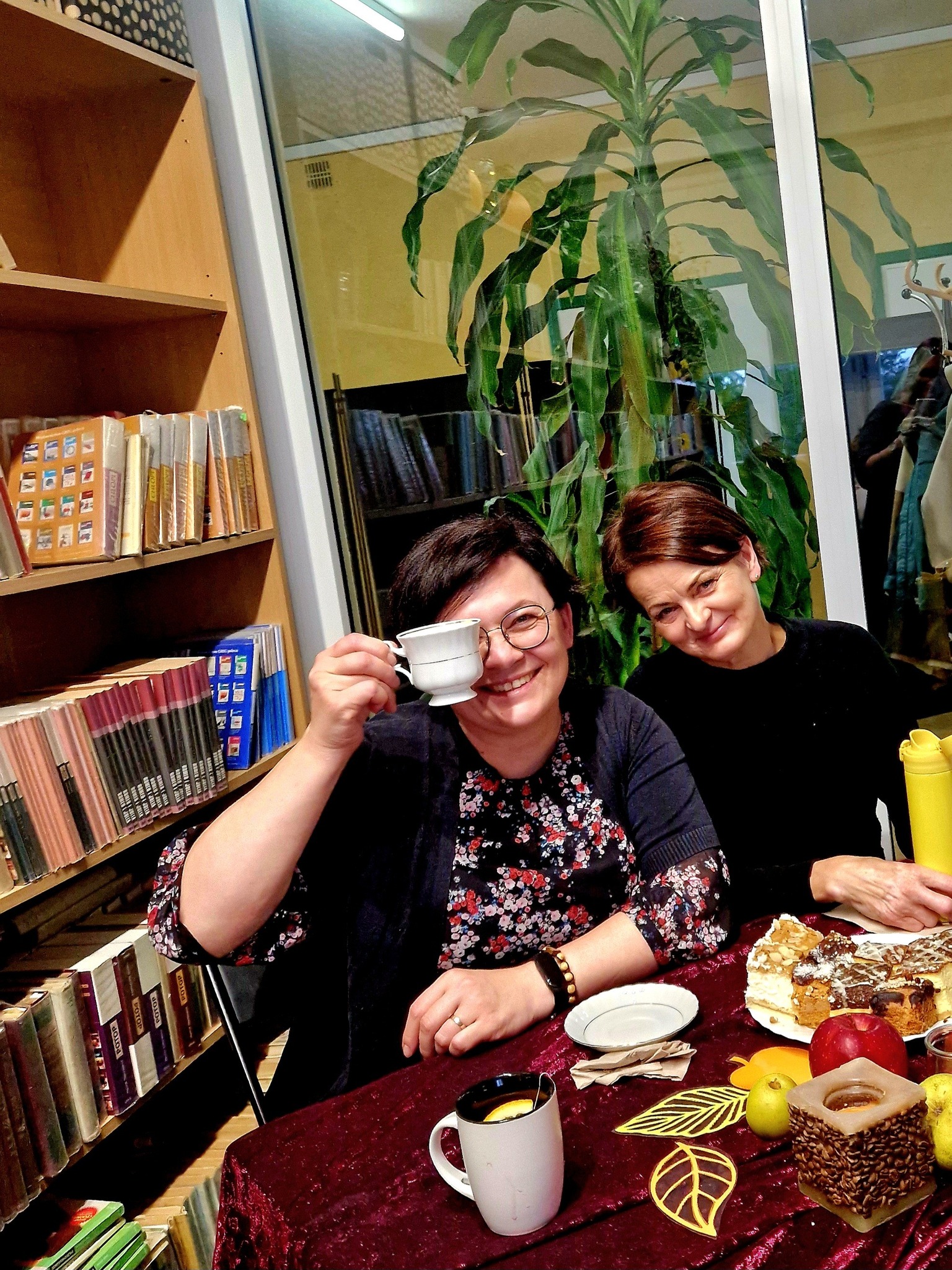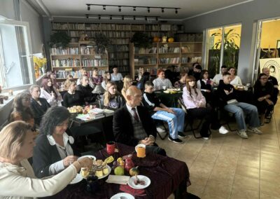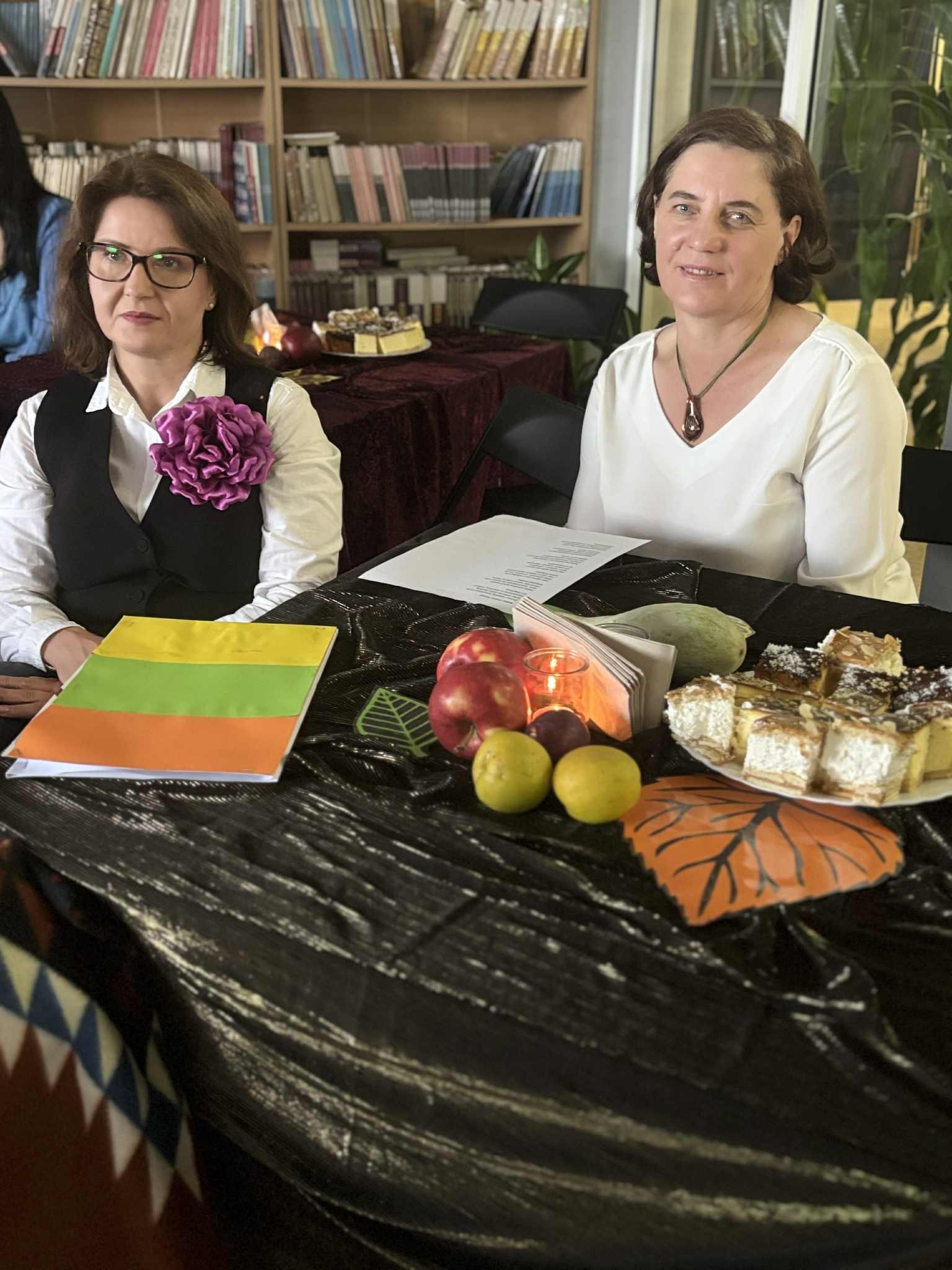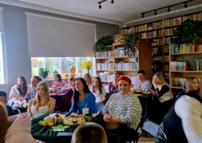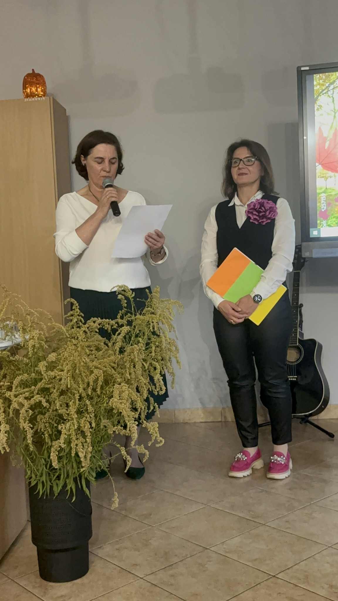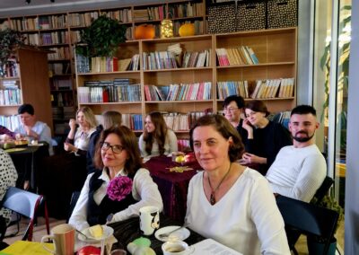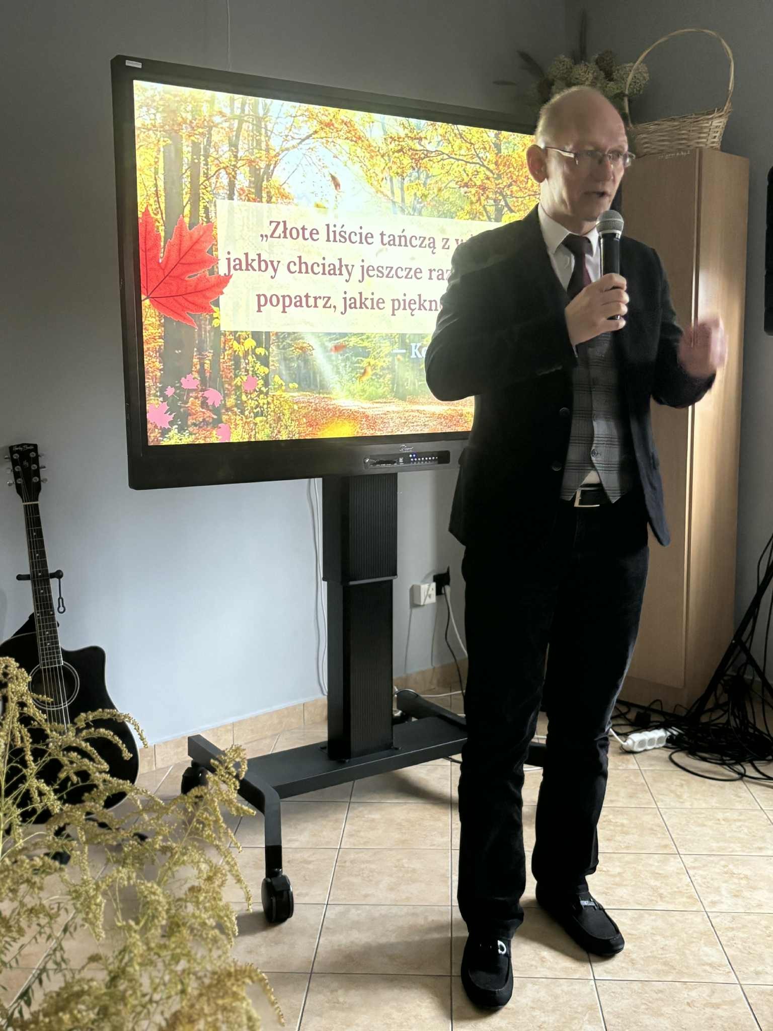 Ale jesień ma także inną twarz – ciemną, nieprzyjemną, z zacinającym, zimnym deszczem i wiejącym wiatrem. Wtedy najchętniej, aby poprawić sobie nastrój, włączamy lampeczki, zapalamy świeczuszki zapachowe i wyciągamy kocyki. Ale są również osoby uzdolnione artystycznie i długie wieczory lubią spędzać na przygotowaniu dekoracji jesiennych. I o tym opowiedziała Aleksandra Sobolewska – przedstawicielka Uniwersytetu III Wieku w Tłuszczu. A jeśli ktoś takich uzdolnień nie posiada, może np. czytać książki. Ale co wybrać? O tym opowiedział Dyrektor Biblioteki Publicznej w Tłuszczu Robert Szydlik. Zaprezentował 5 pozycji książkowych pochodzących z różnych kręgów kulturowych. A może poezja? To doskonałe rozwiązanie na długi, jesienny wieczór, zwłaszcza gdy możemy zrobić sobie kawkę czy herbatkę jesienną. U nas serwowały je Daria Rudnik z klasy 2LO, Marta Węcławek i Julianna Tarka z klasy 1LO a strofy poezji przytoczyły przedstawicielki z Grupy Rekonstrukcji Historycznej Ludności Cywilnej „Rajski Ptak” z Tłuszcza. Ewa Laskowska przeczytała wiersz Juliana Tuwima „Kapuśniaczek” a Bożena Baranowska utwór Adama Asnyka „Astry”.