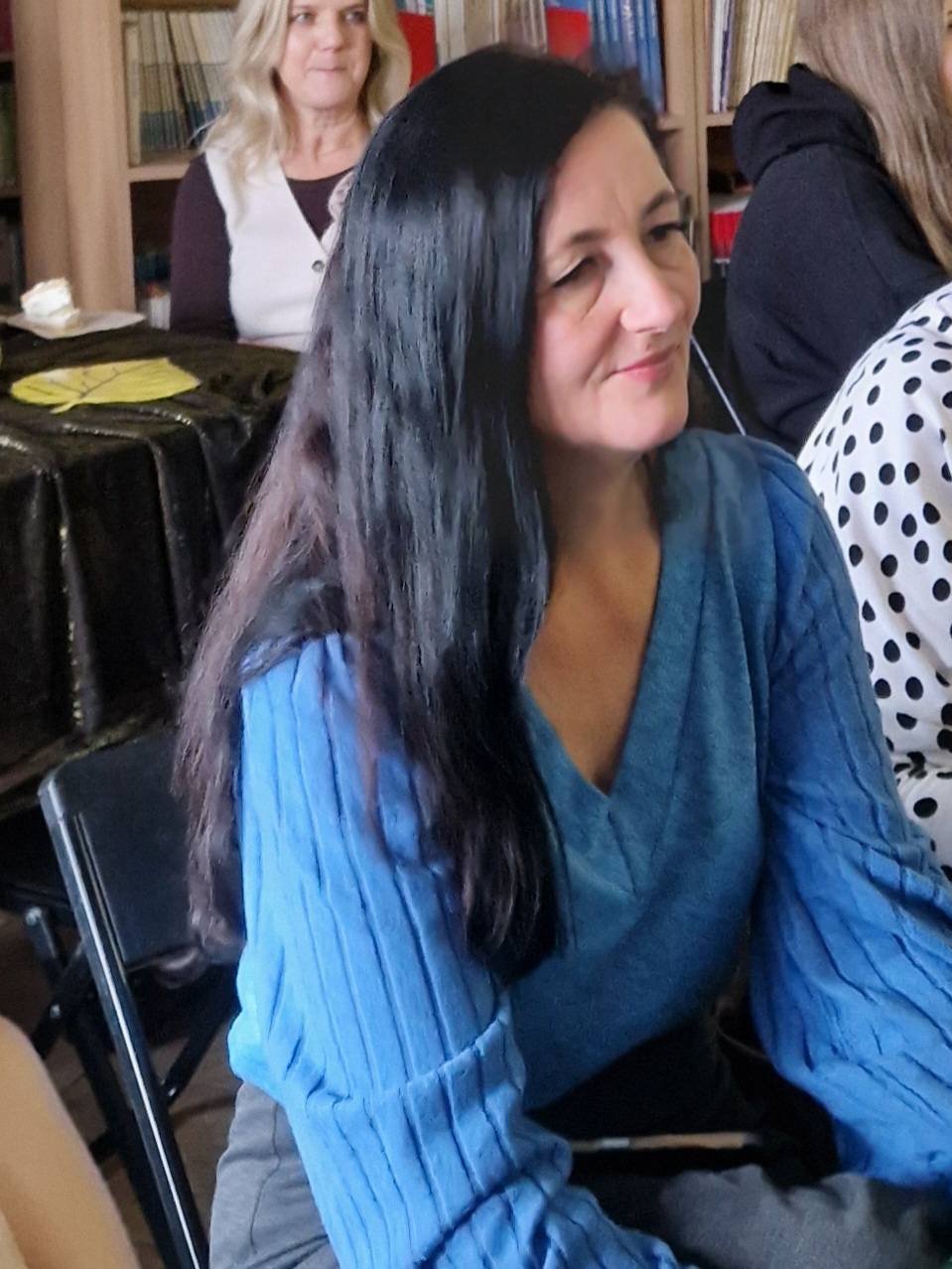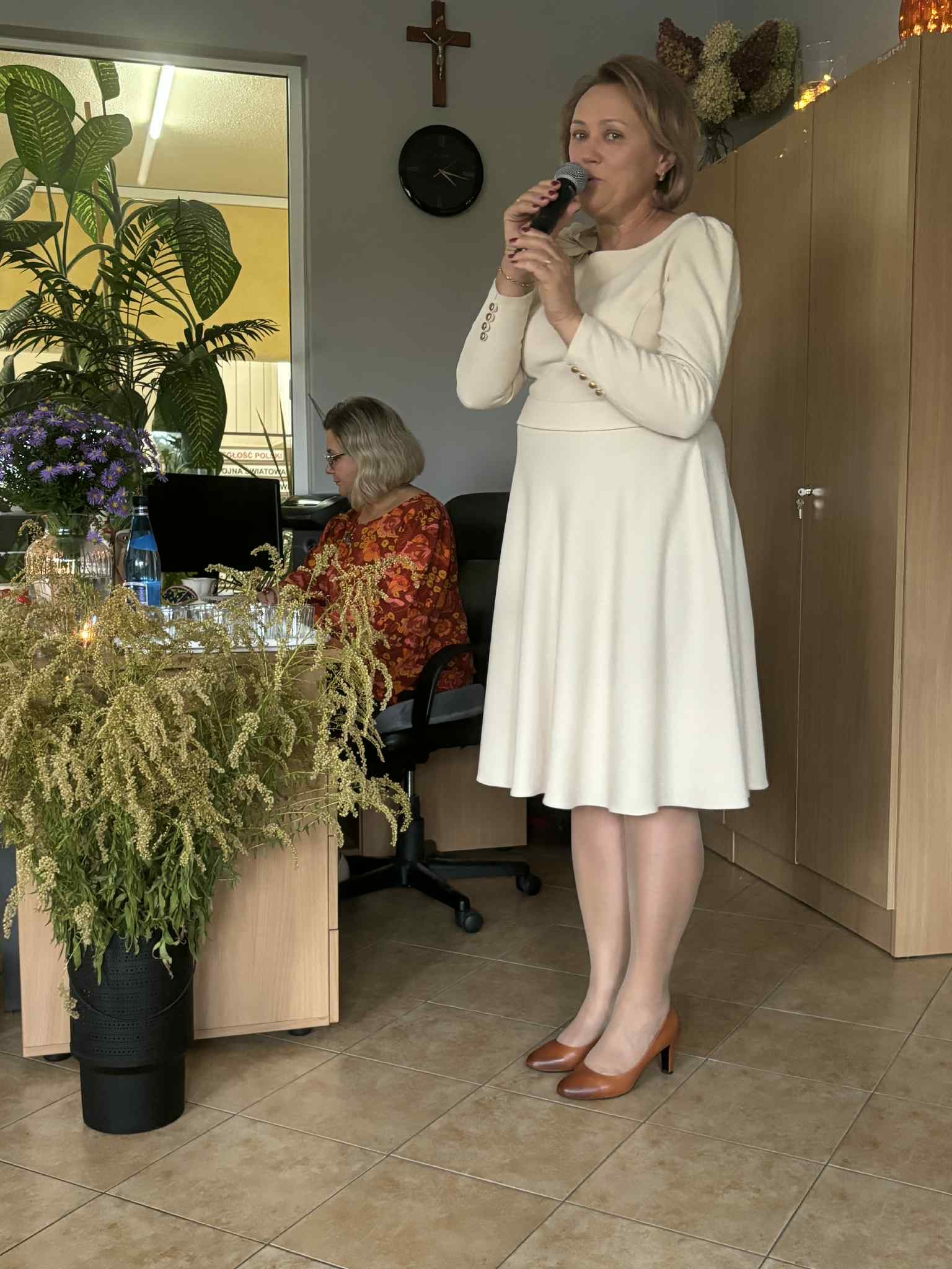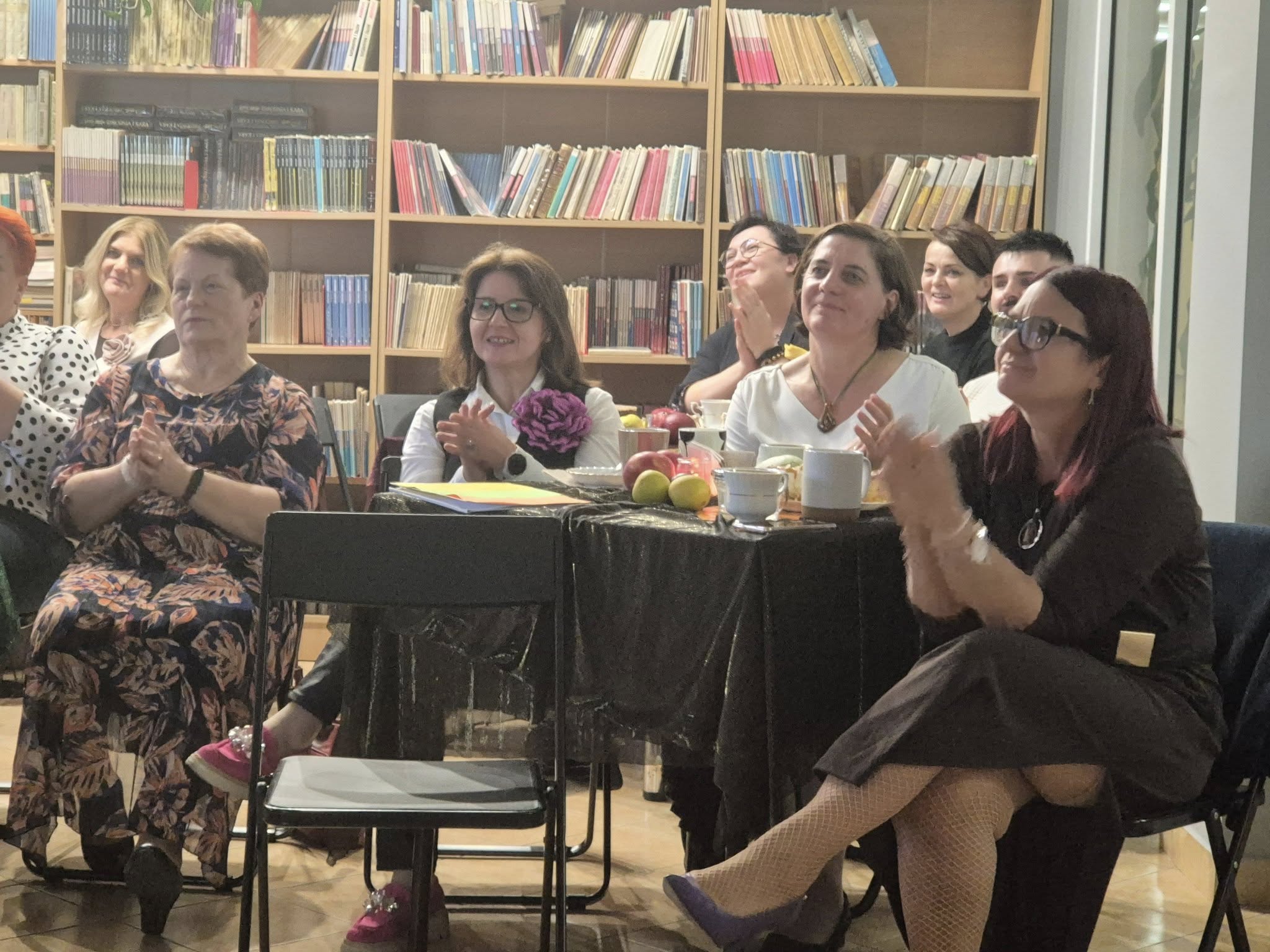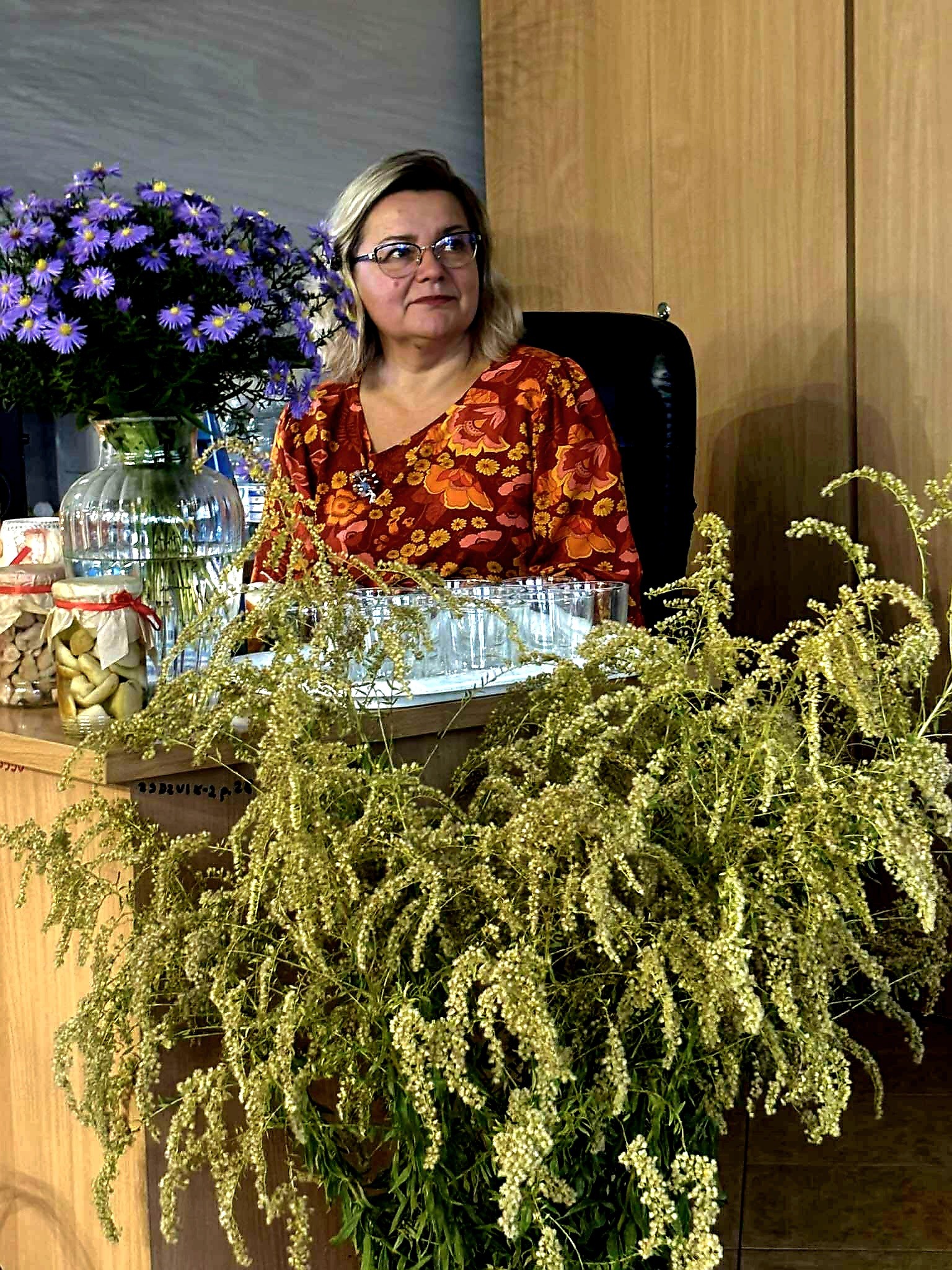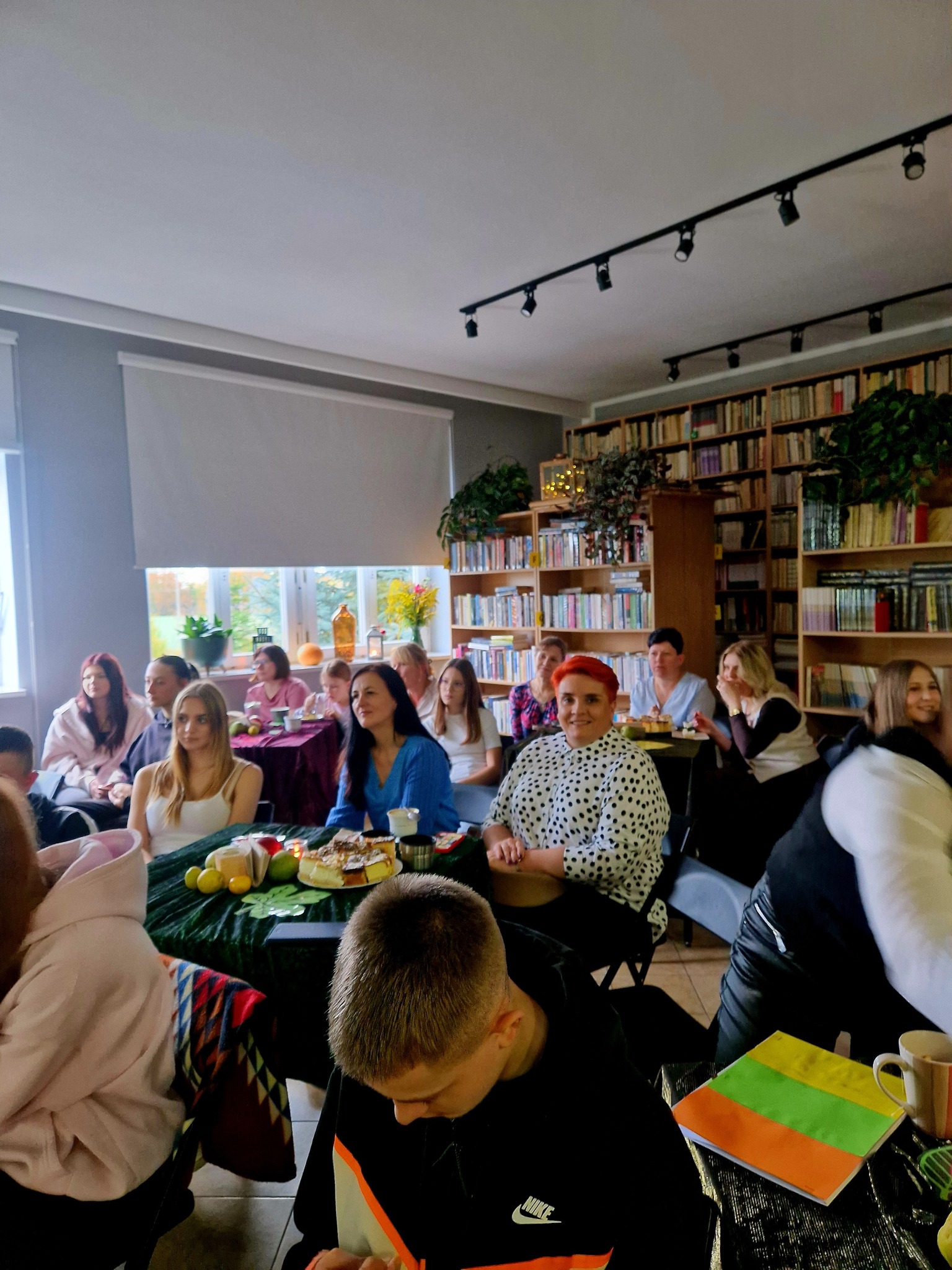 Ale jesień ma także inną twarz – ciemną, nieprzyjemną, z zacinającym, zimnym deszczem i wiejącym wiatrem. Wtedy najchętniej, aby poprawić sobie nastrój, włączamy lampeczki, zapalamy świeczuszki zapachowe i wyciągamy kocyki. Ale są również osoby uzdolnione artystycznie i długie wieczory lubią spędzać na przygotowaniu dekoracji jesiennych. I o tym opowiedziała Aleksandra Sobolewska – przedstawicielka Uniwersytetu III Wieku w Tłuszczu. A jeśli ktoś takich uzdolnień nie posiada, może np. czytać książki. Ale co wybrać? O tym opowiedział Dyrektor Biblioteki Publicznej w Tłuszczu Robert Szydlik. Zaprezentował 5 pozycji książkowych pochodzących z różnych kręgów kulturowych. A może poezja? To doskonałe rozwiązanie na długi, jesienny wieczór, zwłaszcza gdy możemy zrobić sobie kawkę czy herbatkę jesienną. U nas serwowały je Daria Rudnik z klasy 2LO, Marta Węcławek i Julianna Tarka z klasy 1LO a strofy poezji przytoczyły przedstawicielki z Grupy Rekonstrukcji Historycznej Ludności Cywilnej „Rajski Ptak” z Tłuszcza. Ewa Laskowska przeczytała wiersz Juliana Tuwima „Kapuśniaczek” a Bożena Baranowska utwór Adama Asnyka „Astry”.