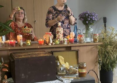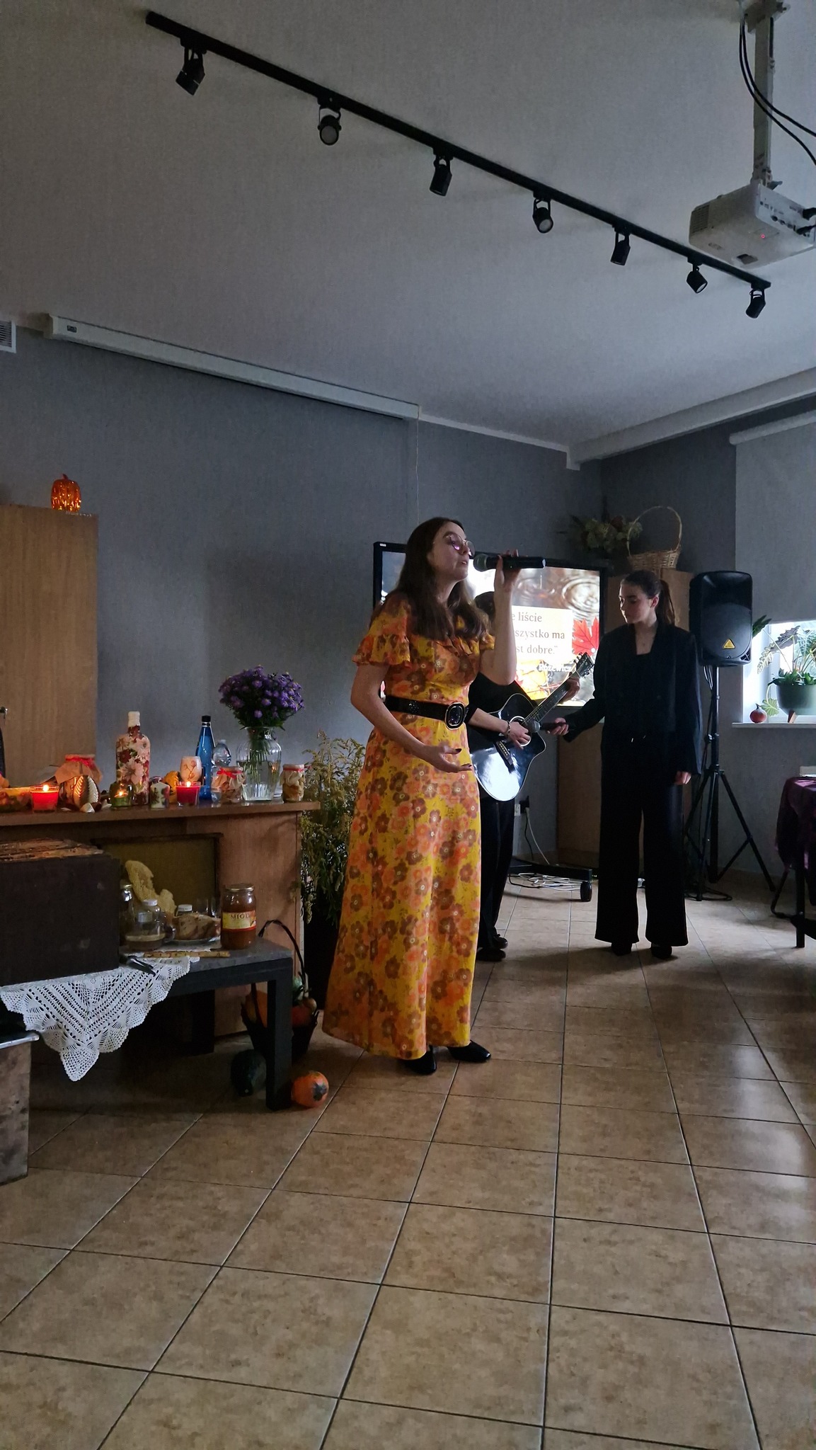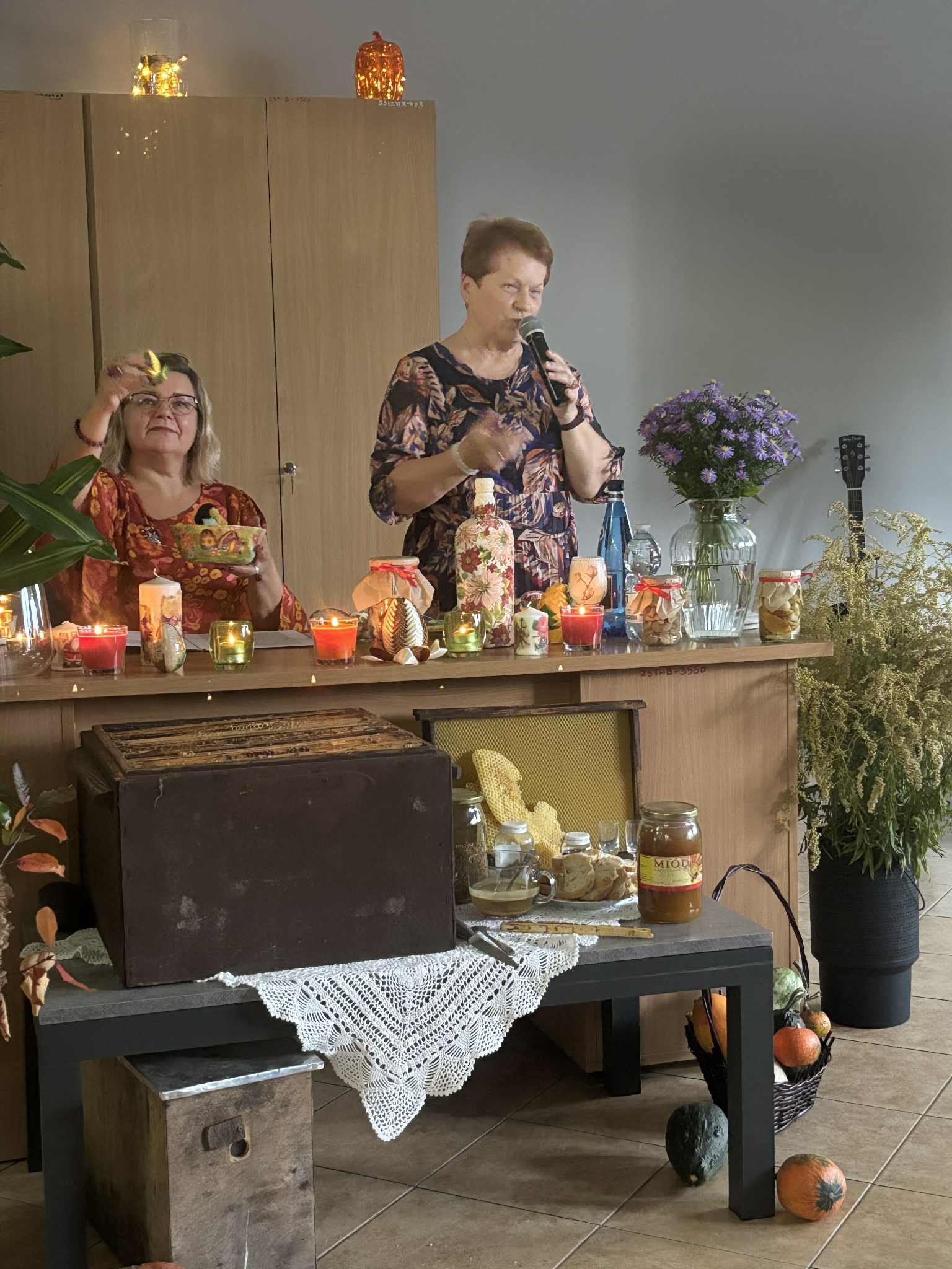 Z kolei Dyrektor Anna Białek – Kowalska opowiedziała o swym dzieciństwie spędzanym na wsi, gdzie jesień kojarzyła się ze zbiorami płodów ziemi, wykopkami, ogniskami i pieczonymi kartoflami, ale również z ciężką pracą na roli. Następnie obejrzeliśmy maluchy z Anielskiego Przedszkola, które szukały jesieni i orzeszków dla wiewiórek. Takie dzieciaczki to sama słodycz , ale podczas spotkania słodyczy u nas nie brakowało, gdyż Paweł Laskowski – lokalny pszczelarz – zaprezentował część ula oraz miody, pyłek pszczeli, pierzgę i inne pszczele wytwory. Zainteresowani mogli posłuchać o zwyczajach pszczół a nawet obserwować doświadczenia, które prowadził Pan Paweł. W trakcie wydarzenia na ekranie wyświetlana była prezentacja zdjęć jesiennych z cytatami o jesieni przygotowana przez wicedyrektora szkoły Marka Leszcza. I właśnie o barwach jesieni i słońcu zaśpiewała Ewelinka Rudnik a akompaniowała jej Marysia Bernatek.