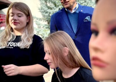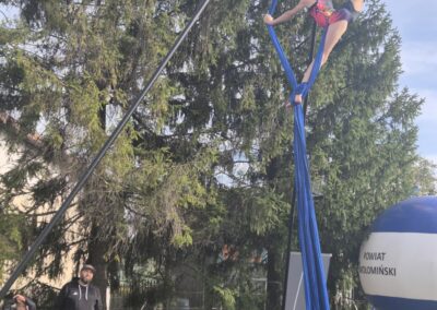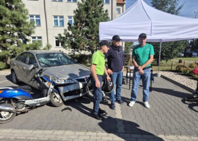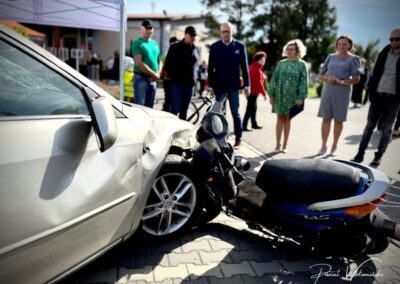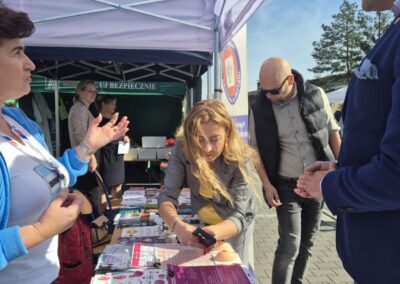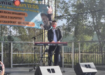 Zespół Szkół im. K.K.Baczyńskiego z kolei przygotował swoje stoisko promocyjne, gdzie można było zapoznać się z ofertą edukacyjną szkoły oraz z jej różnorodną działalnością. Swoje usługi fryzjerskie i kosmetyczne świadczyli uczniowie z klas technik usług fryzjerskich i fryzjer. Ci, którzy zgłodnieli, mogli się pożywić kiełbaską pieczoną w ognisku przez baczyńszczaków. Zaprosiliśmy również do udziału w pikniku Klub Sportowy AcroSports z widowiskowym pokazem akrobacji na szarfach, Studio Treningu Body Prime z pokazem sztuk walki, firmę PIOTRO-STAL, która pokazała samochód, motocykl i hulajnogę po wypadku. Nasze zaproszenie przyjęła również Komisja Bezpieczeństwa i Ochrony Środowiska Gminy Tłuszcz, która zorganizowała konkurs o bezpieczeństwie z nagrodami. Można było także zgłosić sytuacje wymagające poprawy bezpieczeństwa w Gminie Tłuszcz czy pomysły rozwiązań poprawiających to bezpieczeństwo.