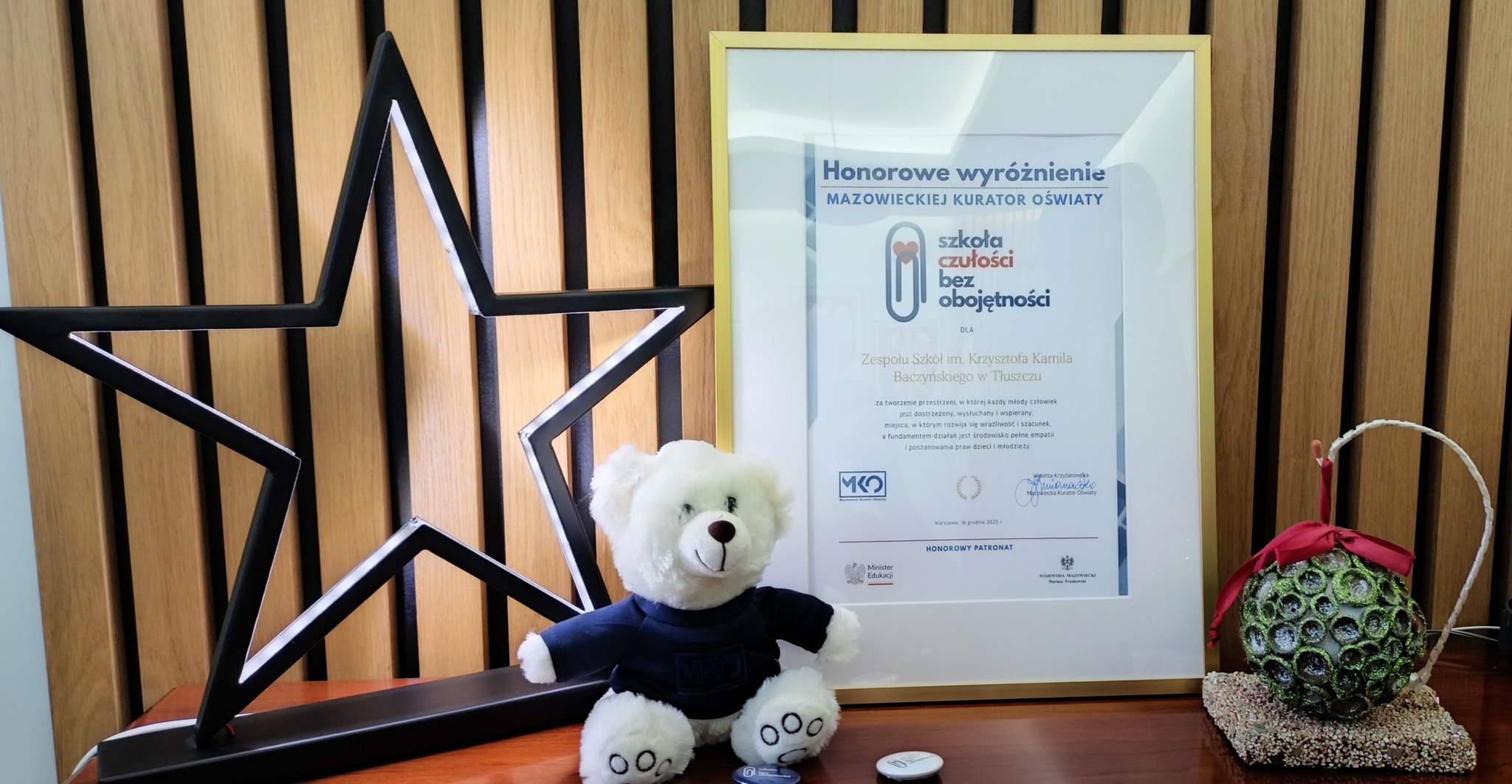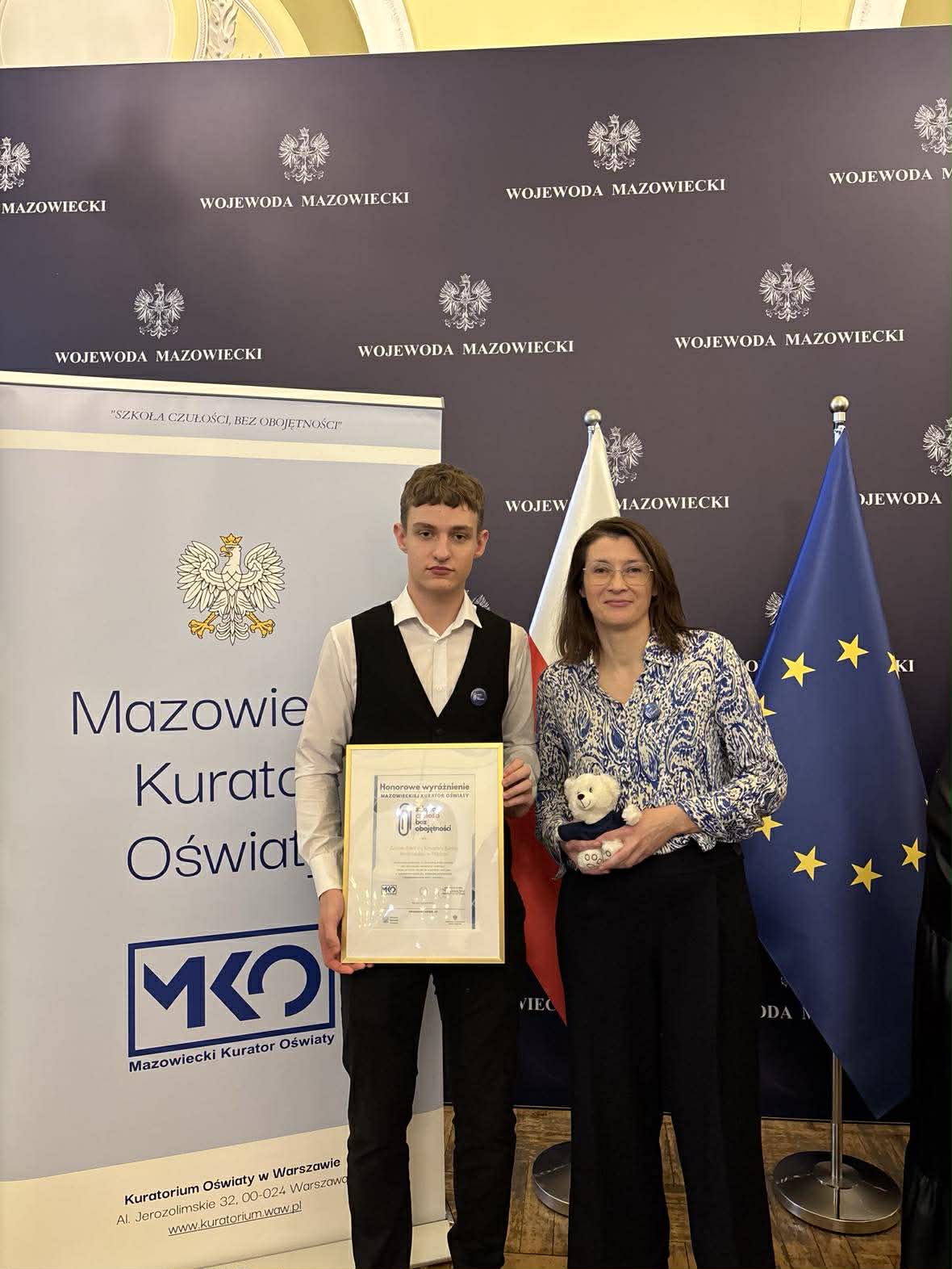 Wyróżnienia „Szkoła czułości, bez obojętności” zostały uroczyście wręczone 16 grudnia 2025 roku podczas gali w Mazowieckim Urzędzie Wojewódzkim w Warszawie. W imieniu całej szkolnej społeczności baczyńszczaków odebrali je Jolanta Szulim – nauczyciel języka polskiego wraz z uczniem klasy 3LG – Adamem Rudnikiem.