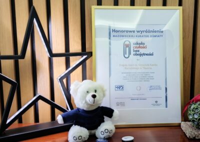 Wyróżnienie „Szkoła czułości, bez obojętności” zostało po raz pierwszy wręczone przez Mazowiecką Kurator Oświaty Wiolettę Krzyżanowską w bieżącym roku szkolnym. Naszą szkołę uhonorowano tym prestiżowym tytułem jako jedną ze 119 placówek. Warto dodać, że zgłoszonych zostało aż 230 placówek z województwa mazowieckiego.